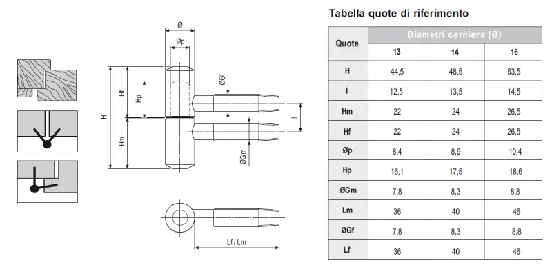 - Lunghezza corpo cerniera: 44,5 mm