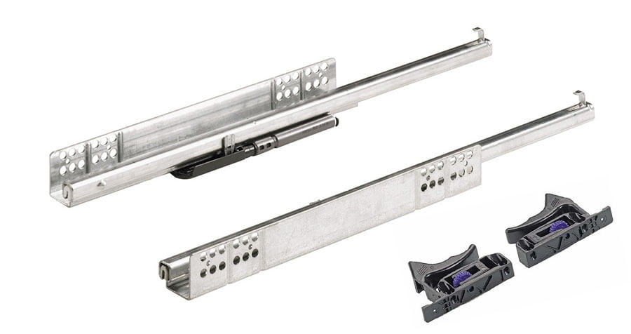 – Guide ammortizzate invisibili con fissaggio a fianco del mobile